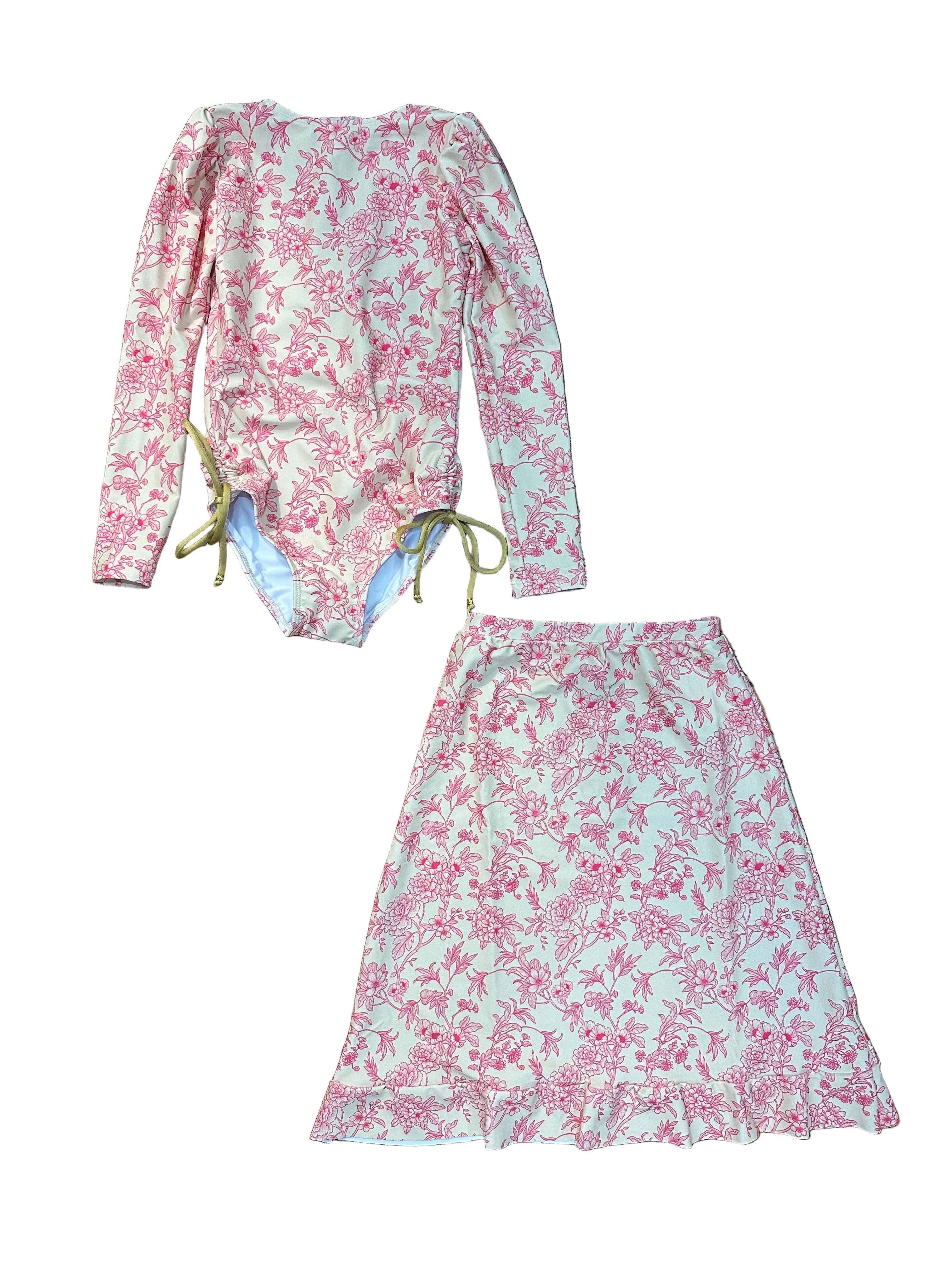 Olga Valentine Girls Bloom Long Sleeve Rashguard One Piece and Swim Skirt Set