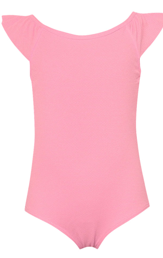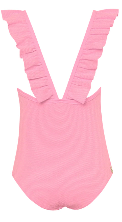 One-piece short sleeve swimsuit with round neckline and deep back neckline with ruffles. The fabric has UPF50+ protection factor which means that it acts as a protective shield against the sun's UV rays. Made in Colombia