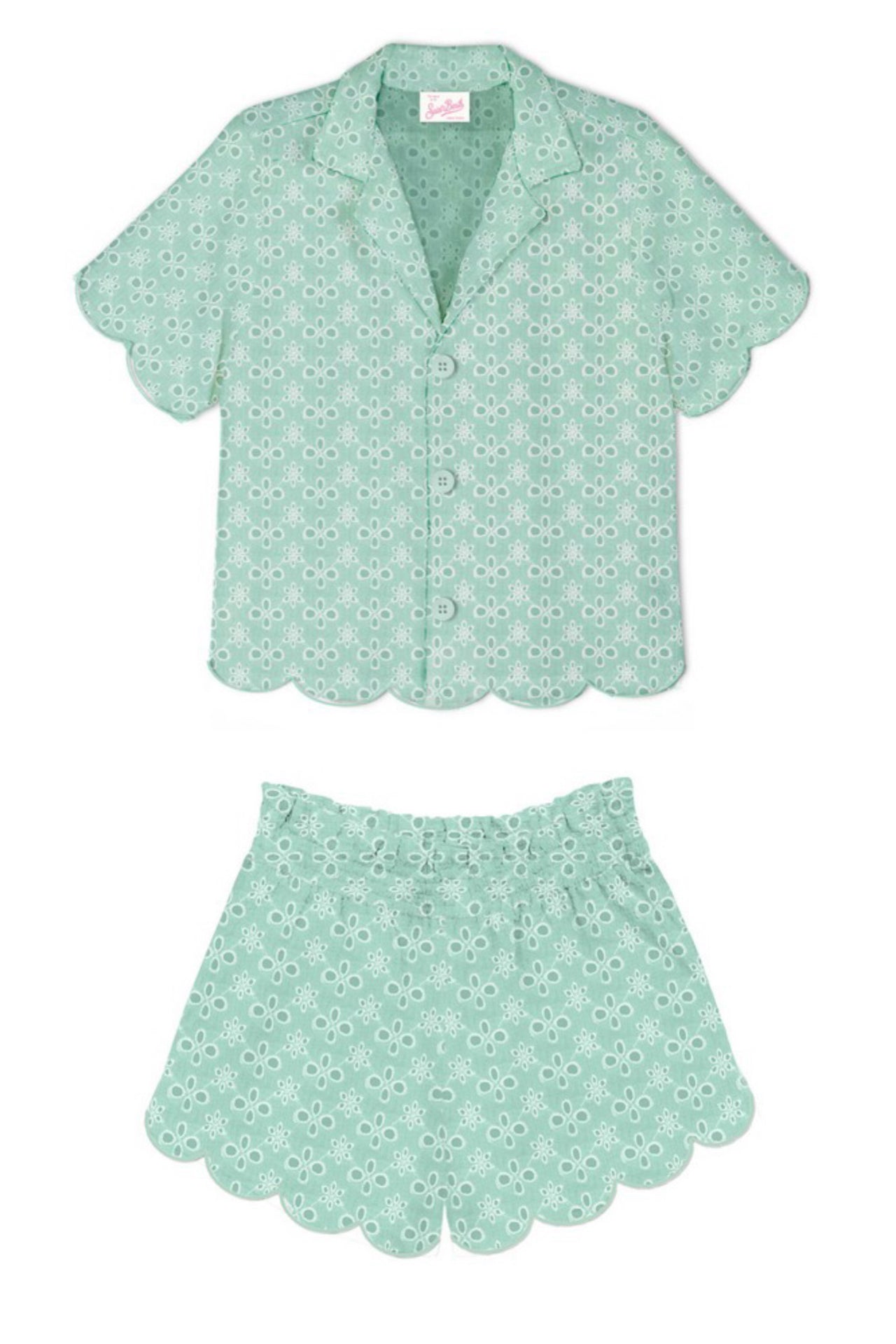 Mc2 Saint Barths Girls Green Mini Flowers Embroidered Short Sleeve Button Down and Shorts Set