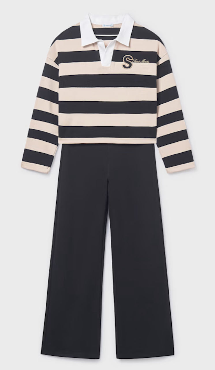 Mayoral Big Girls Black Stripe Pants and Polo Set F/W