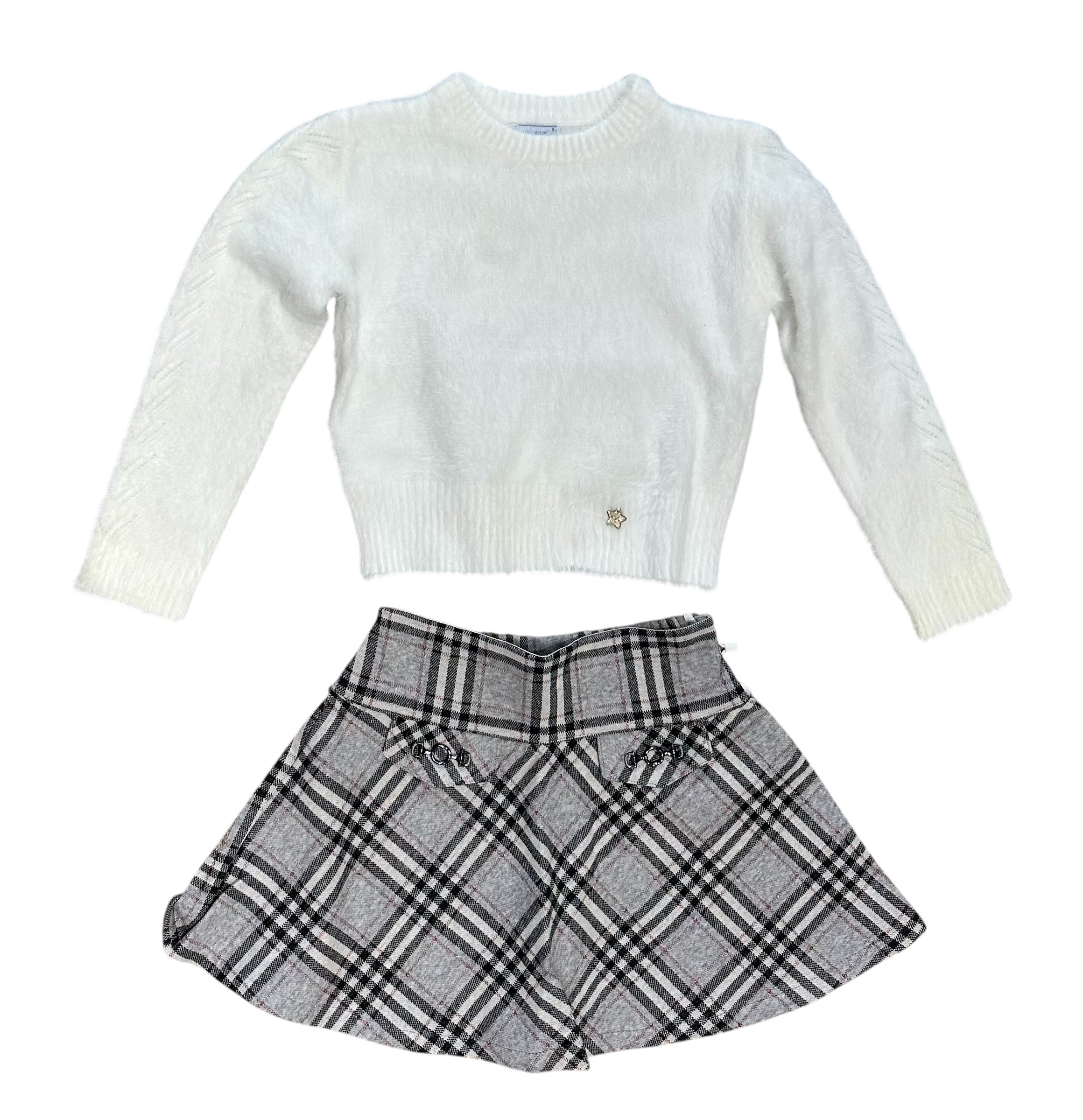 Mayoral Girls Ecru Fuzzy Sweater and Plaid Skirt Set F/W