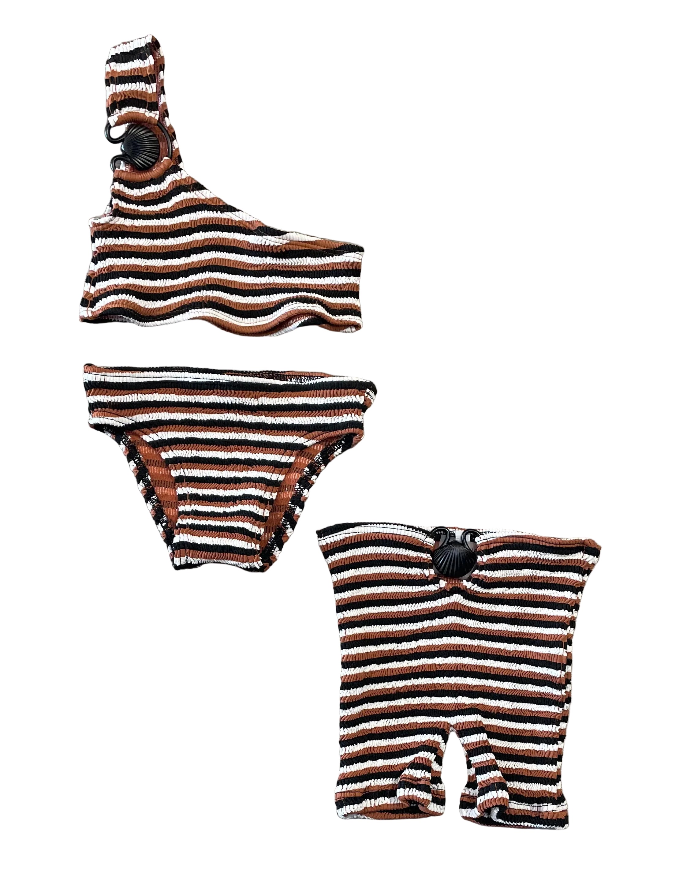 Cleonie Girls Espresso Stripe One Shoulder with Shell Seakini and Shorts Set