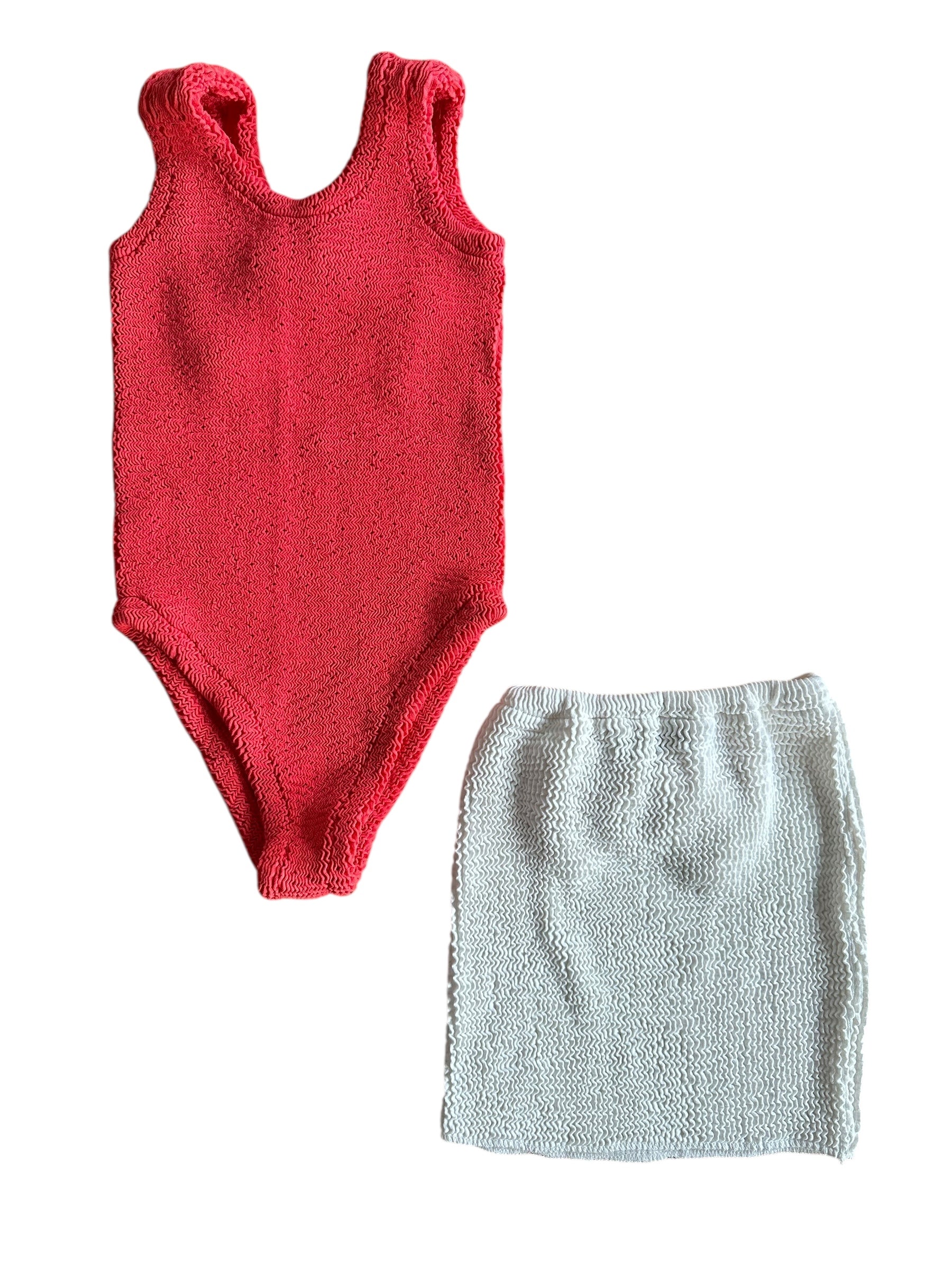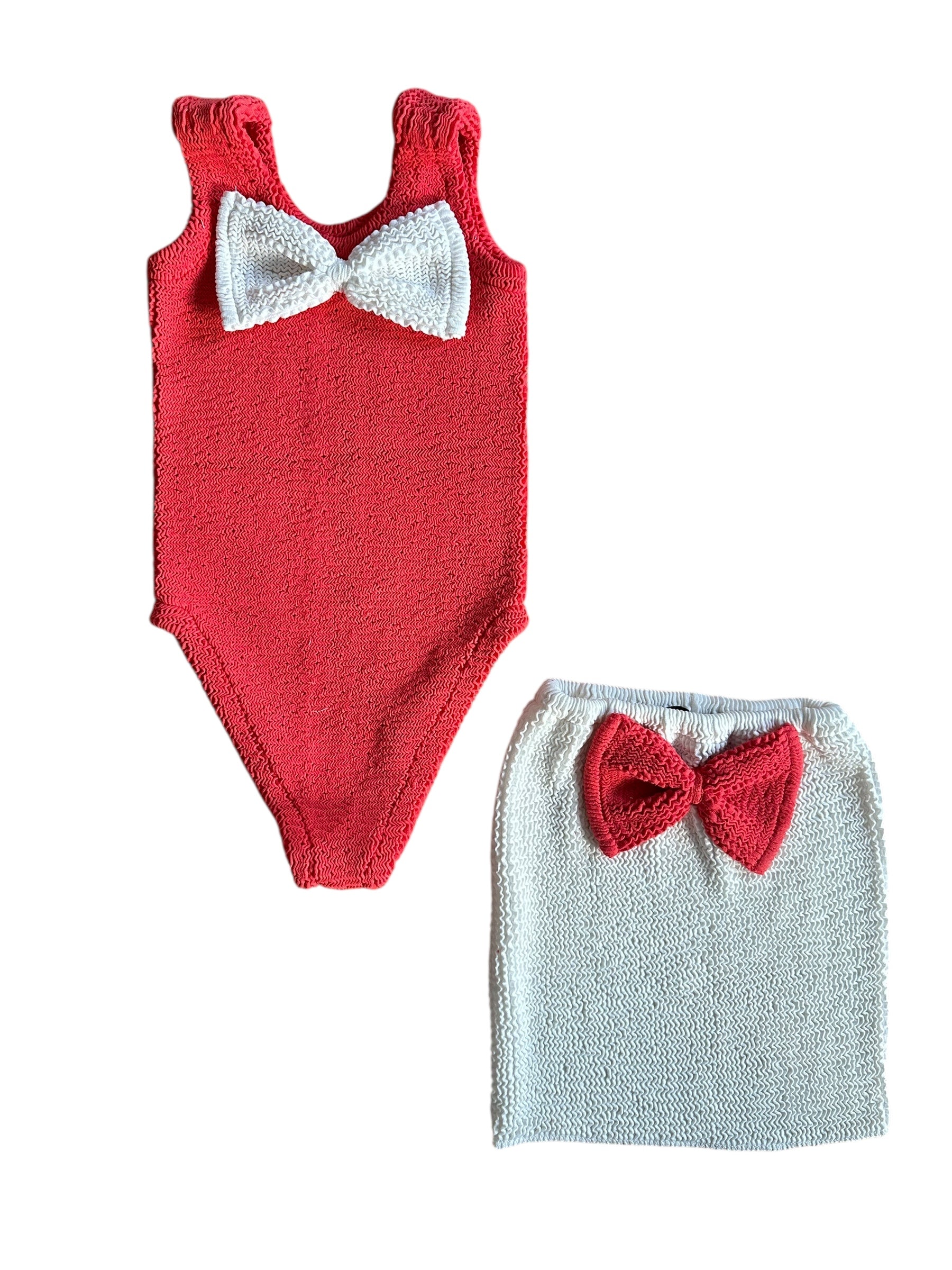 Girls Red with White Bow Wrinkle One Piece and Skirt Set