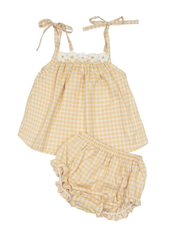 Wild Wawa Baby Girls Yellow Gingham Daisy Crochet Trim Top and Bloomers Set