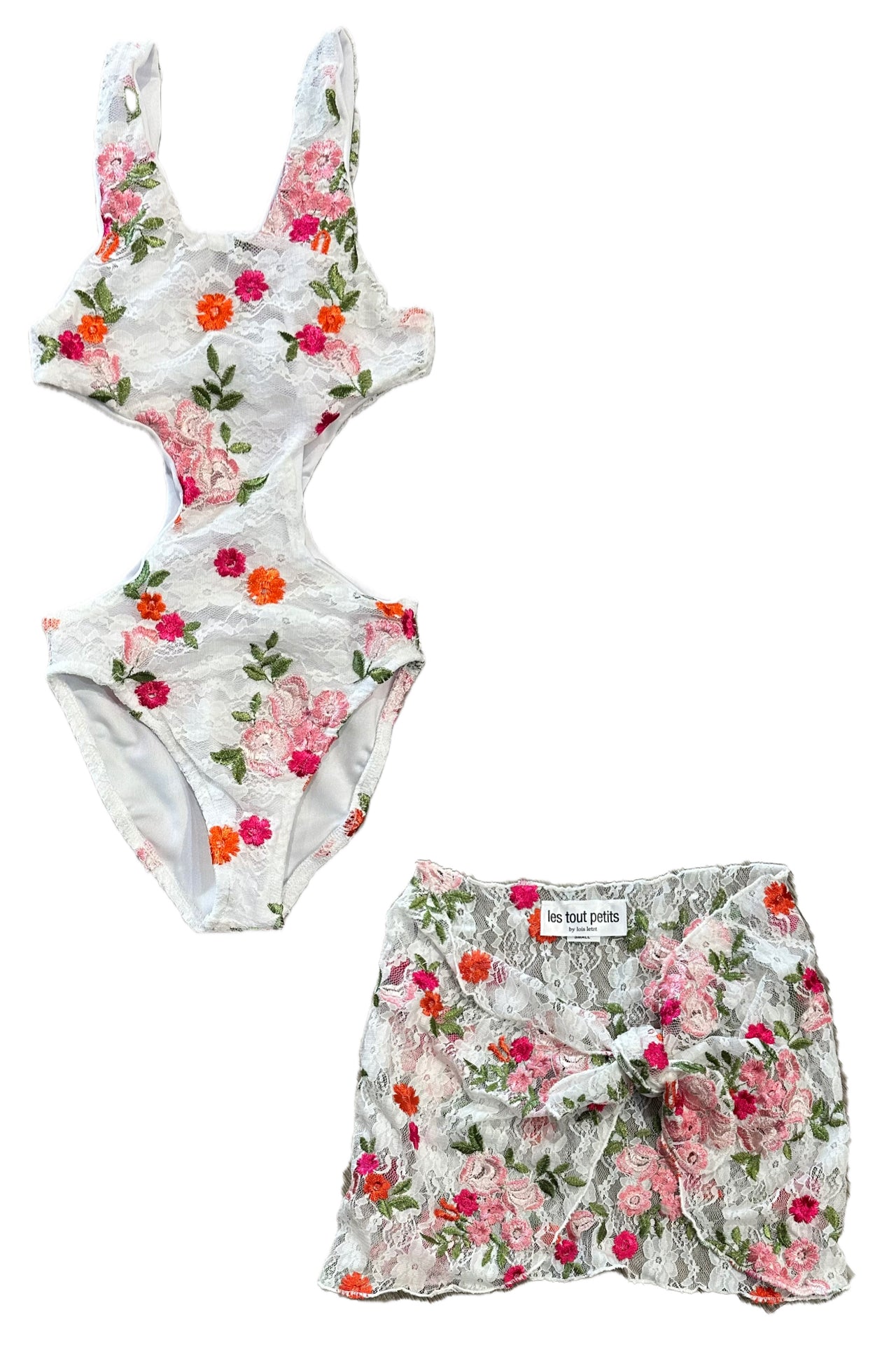 Les Tout Petits Girls Lace Floral Embroidered One Piece Monokini and Sarong Set