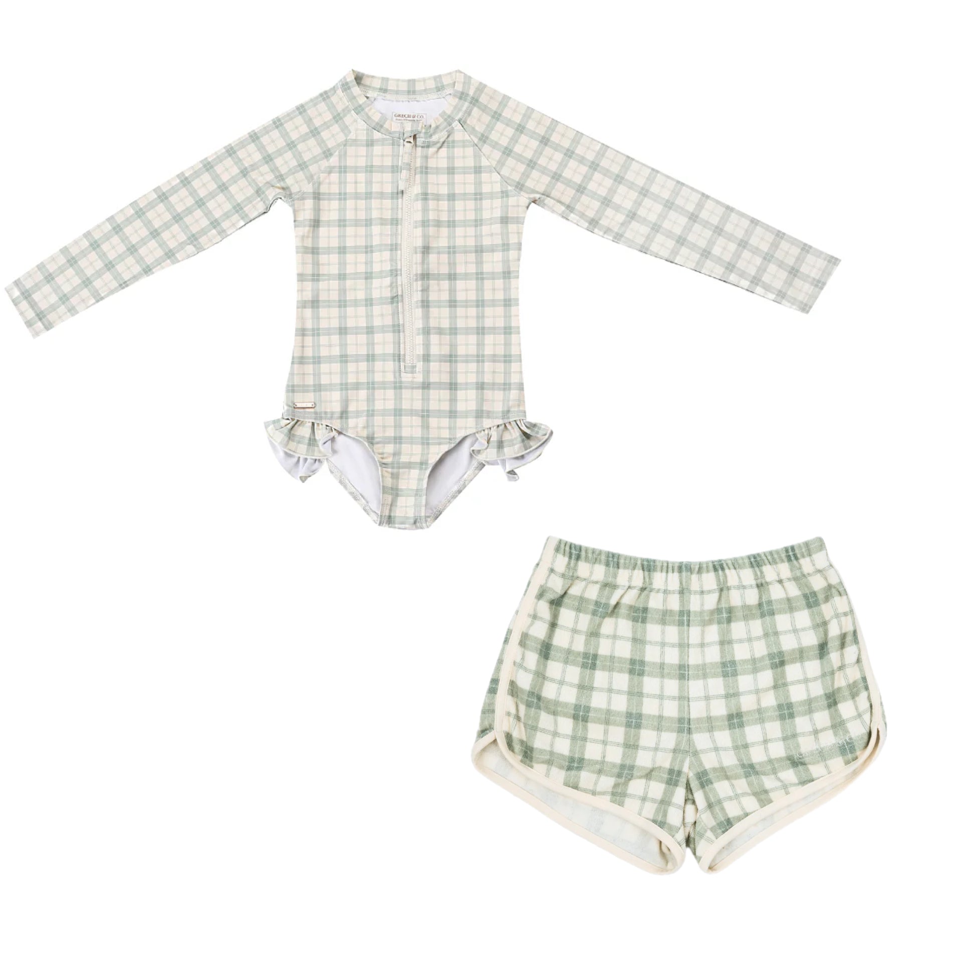 Grech & Co Girls Fern Plaid Long Sleeve Rashguard One Piece and Terry Shorts Set