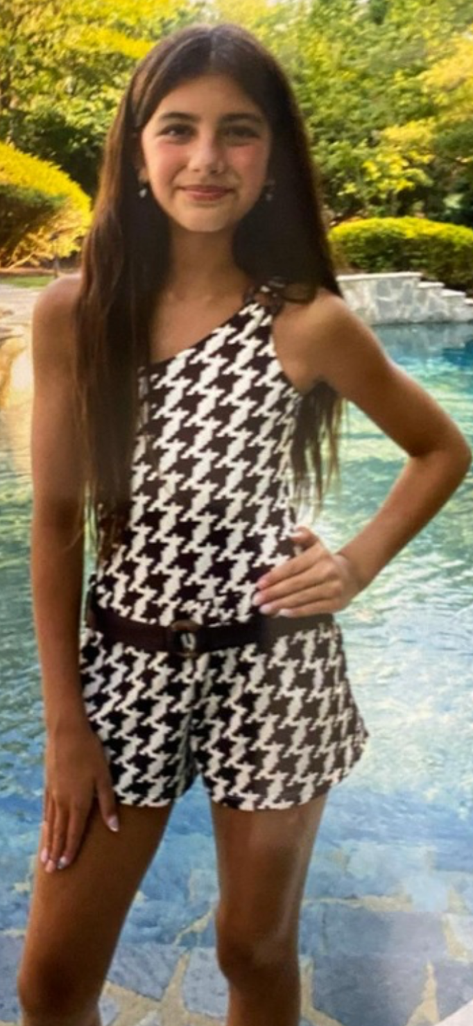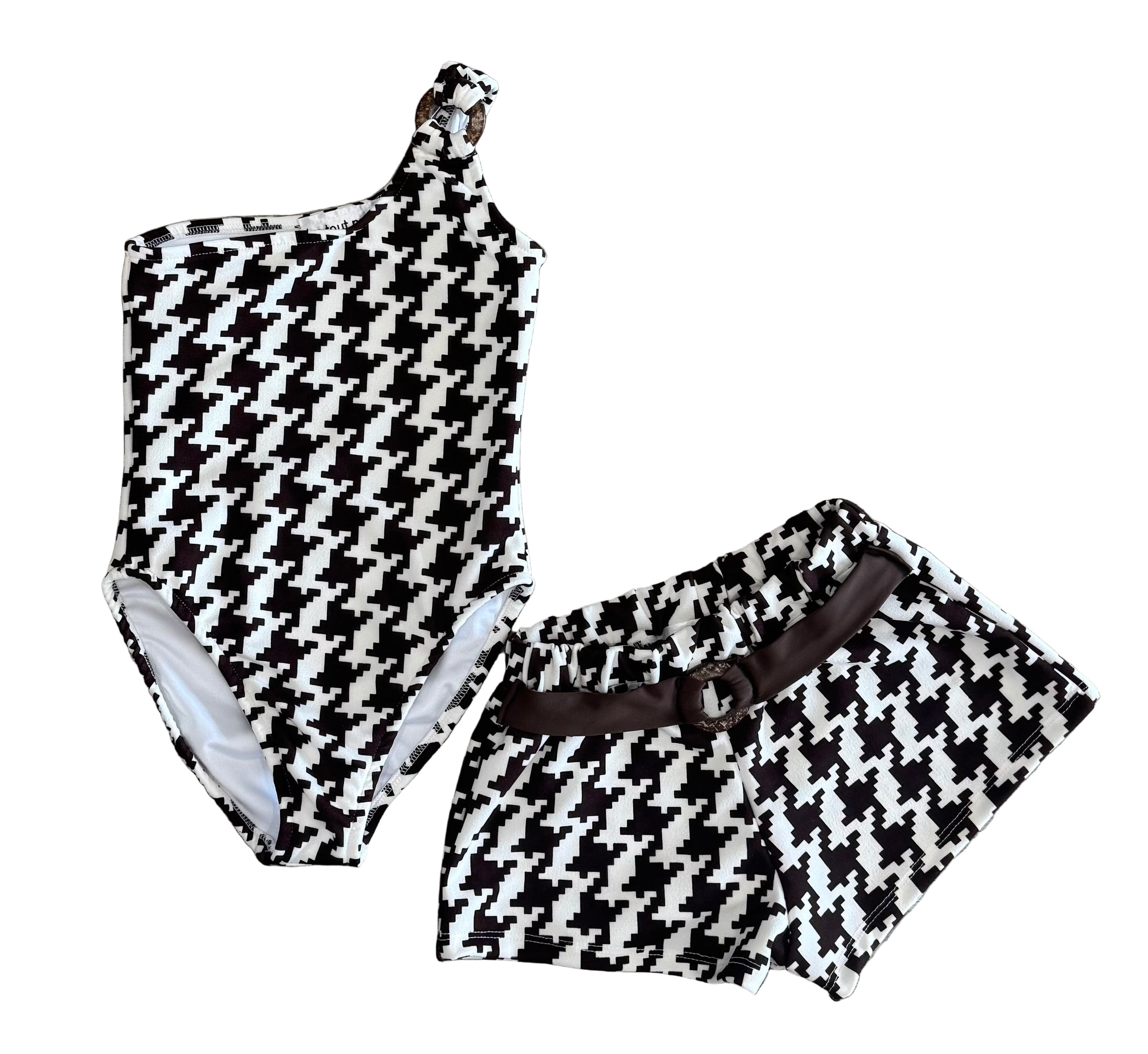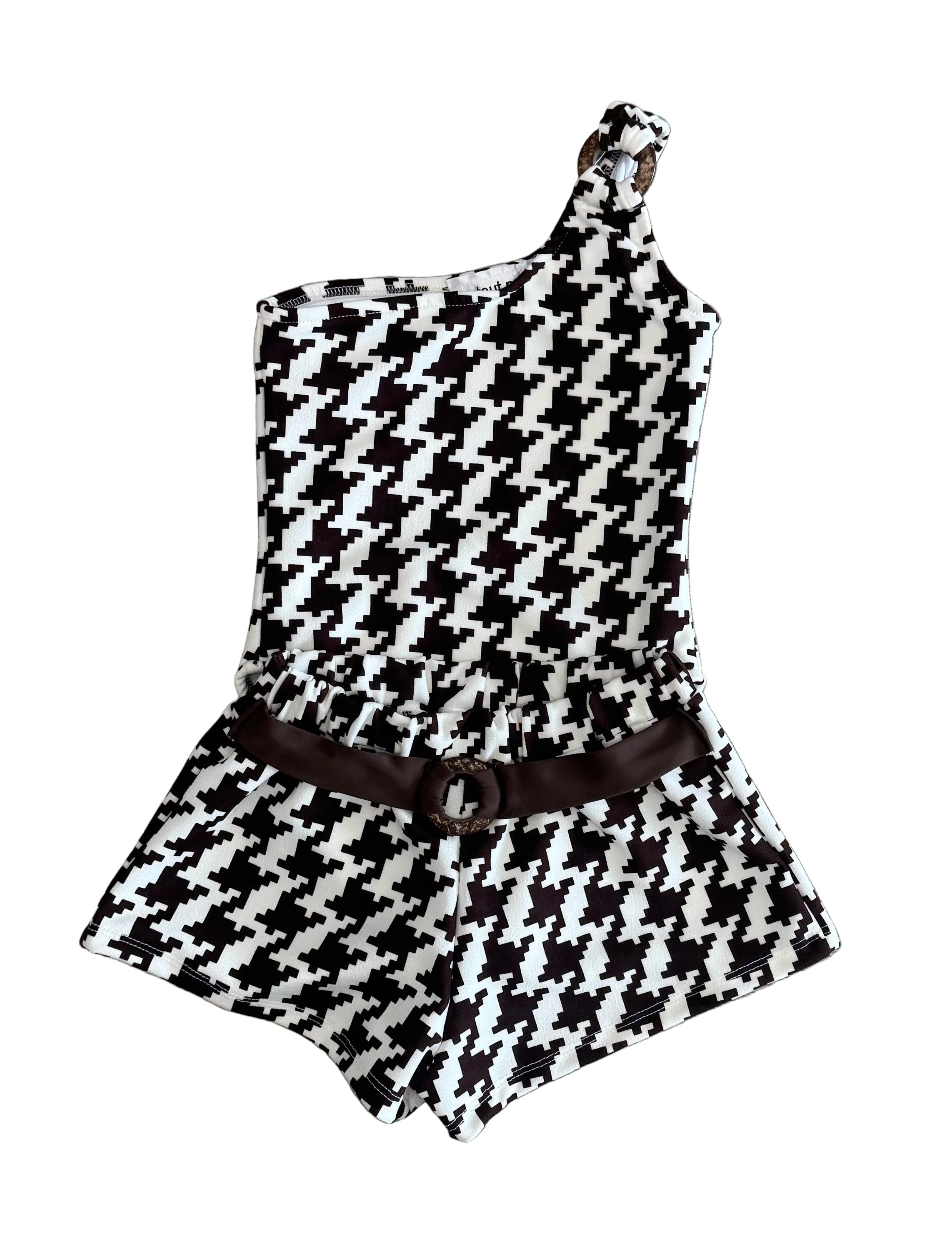 Les Tout Petits Girls Chocolate Houndstooth One Shoulder One Piece and Belted Short Set