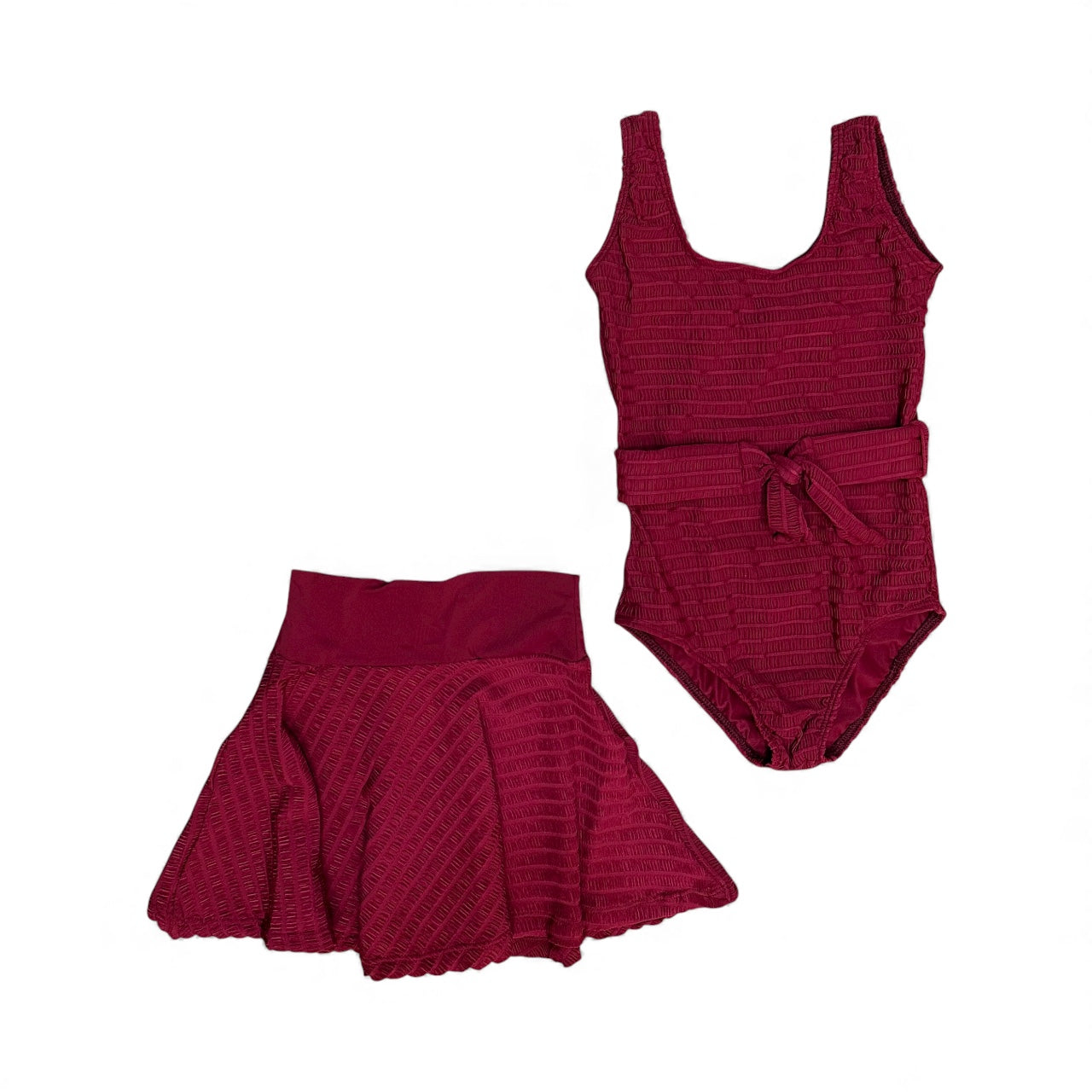 Planet Sra Girls Textured Burgundy Belted One Piece and Skirt Set