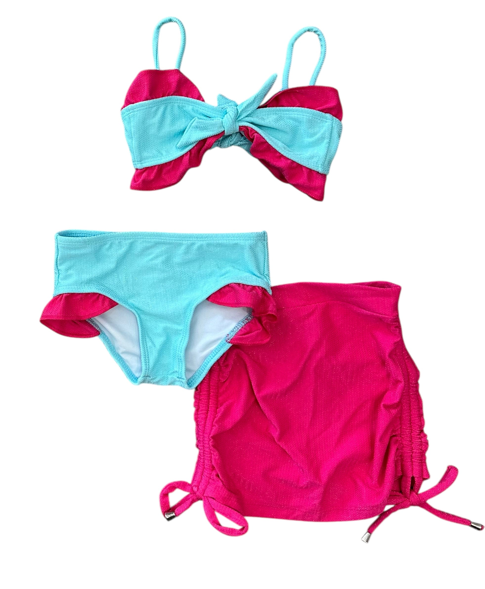 Planet Sea Girls Pink and Turq Textured Bikini and Scrunch Skirt Set