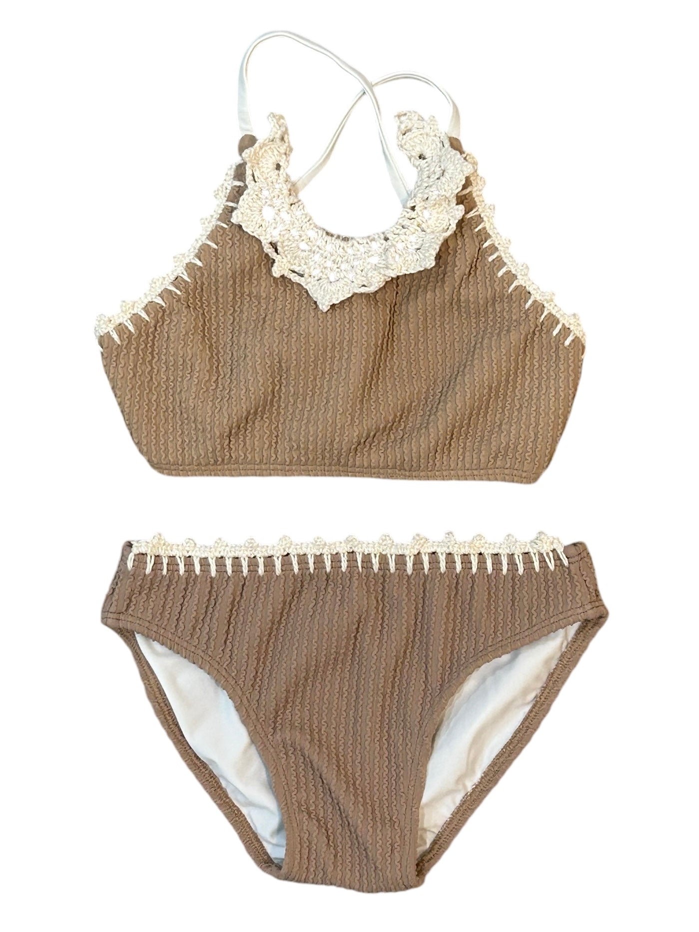 Planet Sea Girls Tan Textured Halter Top Crochet Trim Bikini